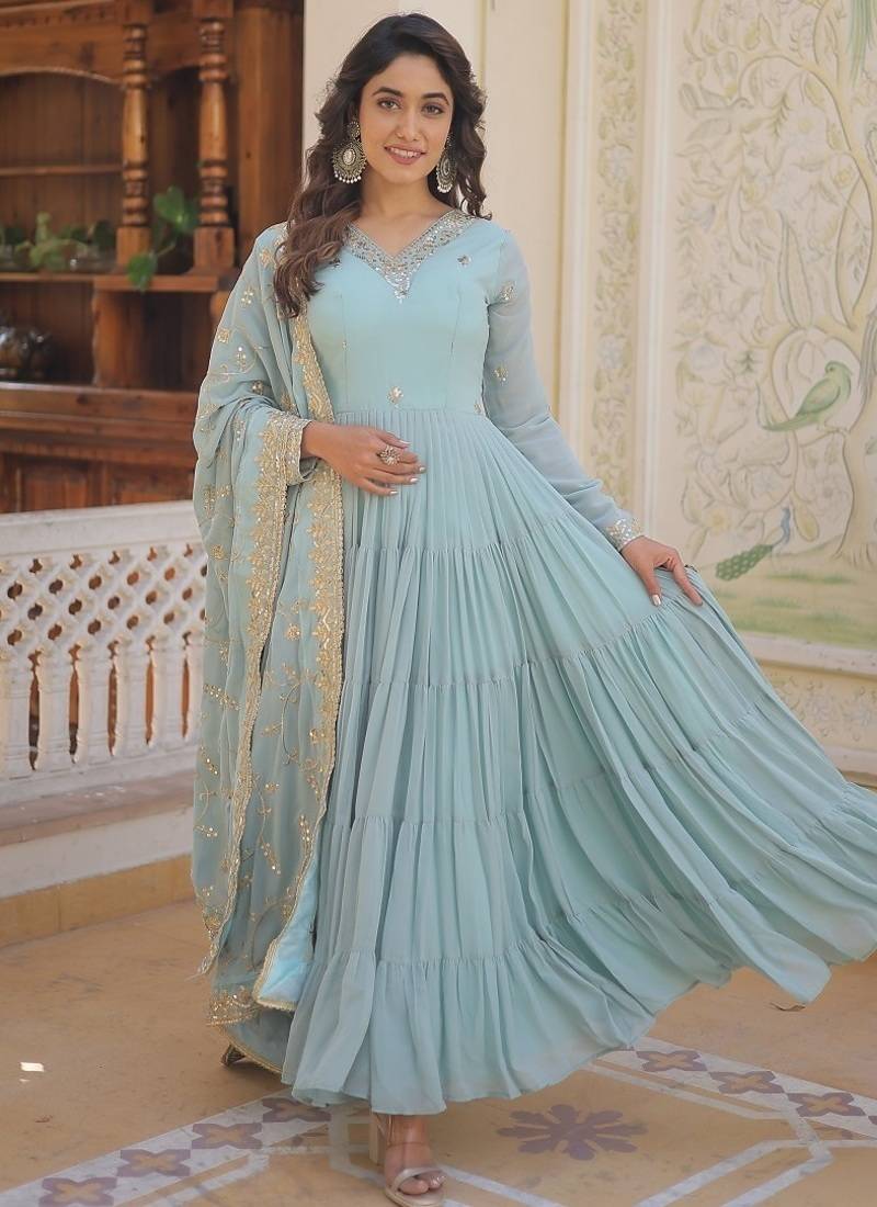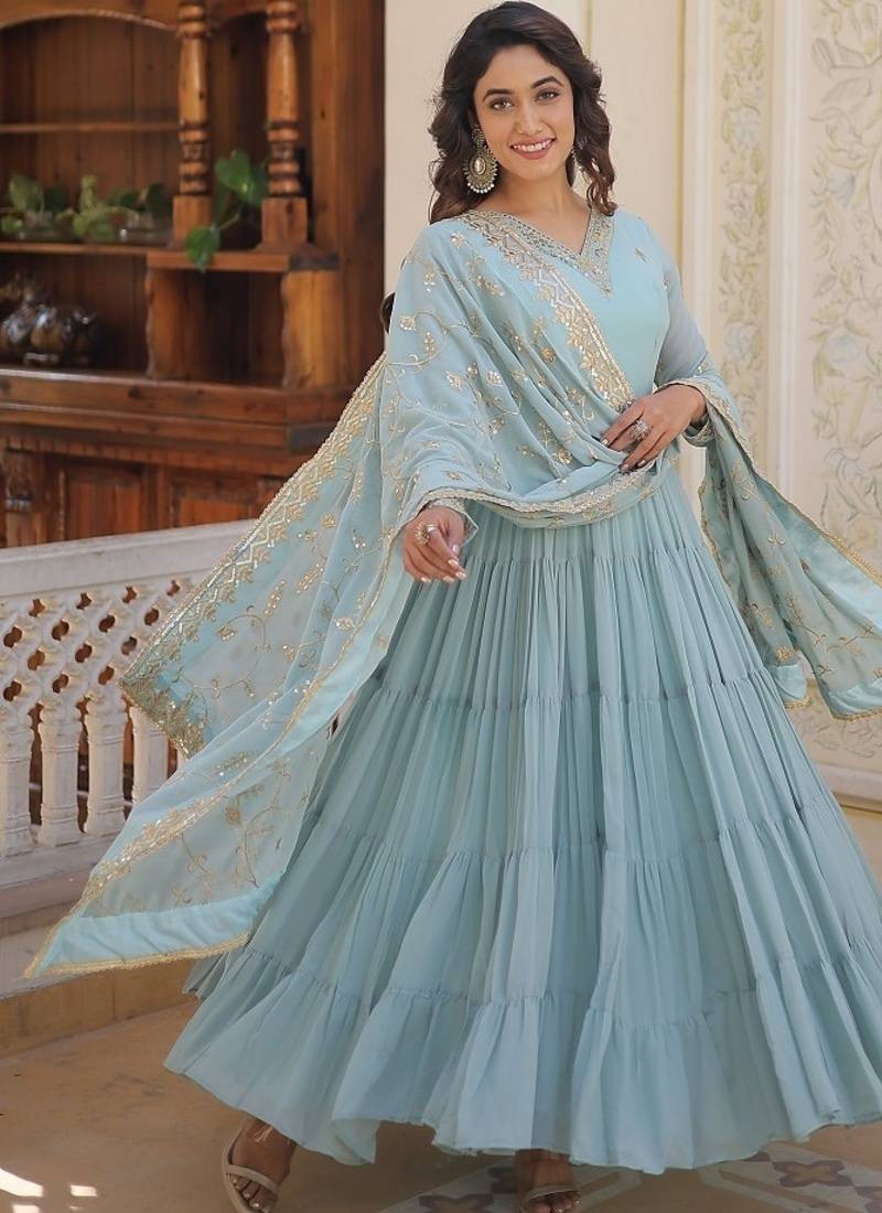 Sky blue color embroidered work georgette gown with dupatta stitched