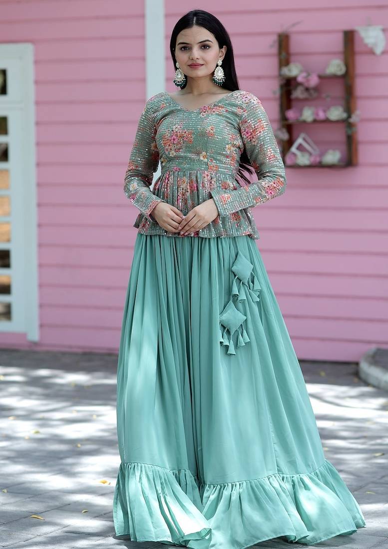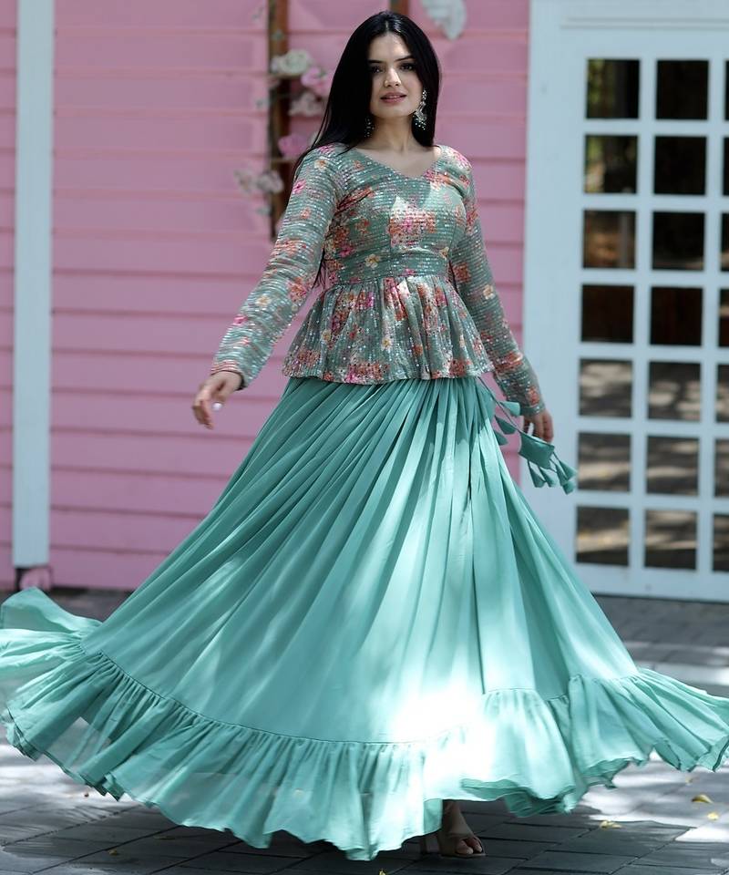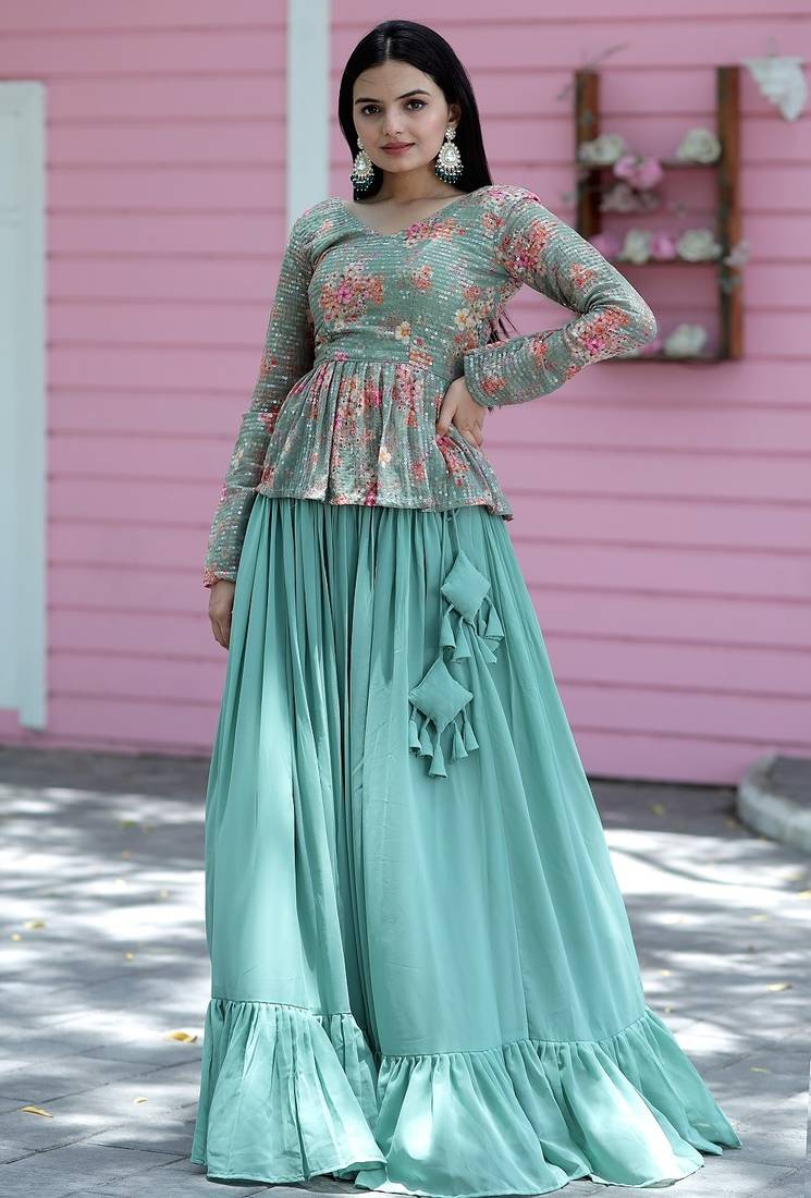 | Product Description | Flower Digital Print & Rich Sequins Embroidered Work Blouse With Plain Lehenga With Frill Stitch Gives Adorable Fashionable Full Flaired Looks Amazing For Any Functions And Partywear Collections.Lehenga Full Stitched Fabric & Work Faux Georgette