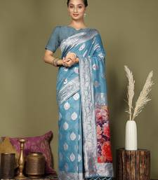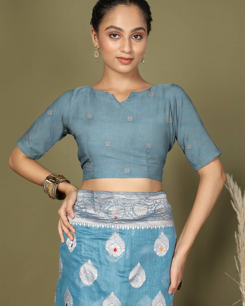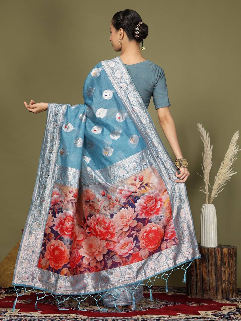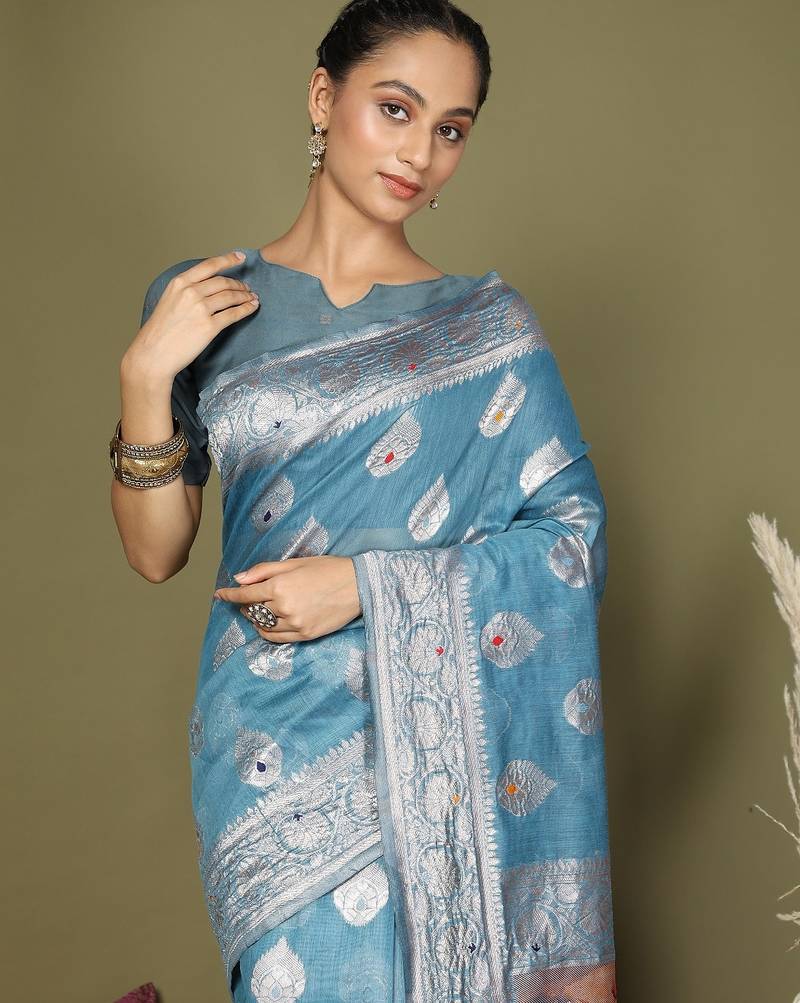 | Product Name | Sky Blue Color Linen Cotton Woven Work Flower Pallu Saree | |