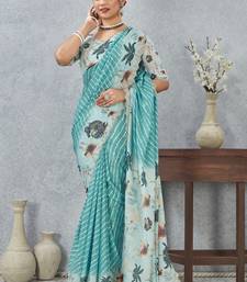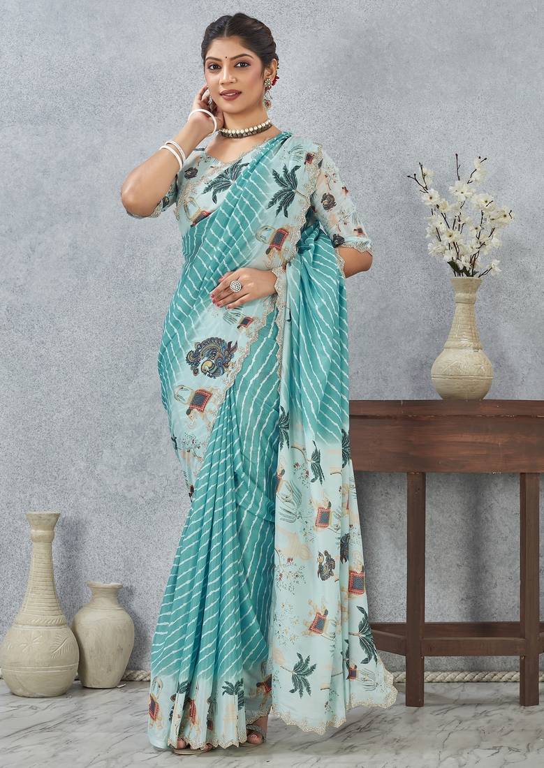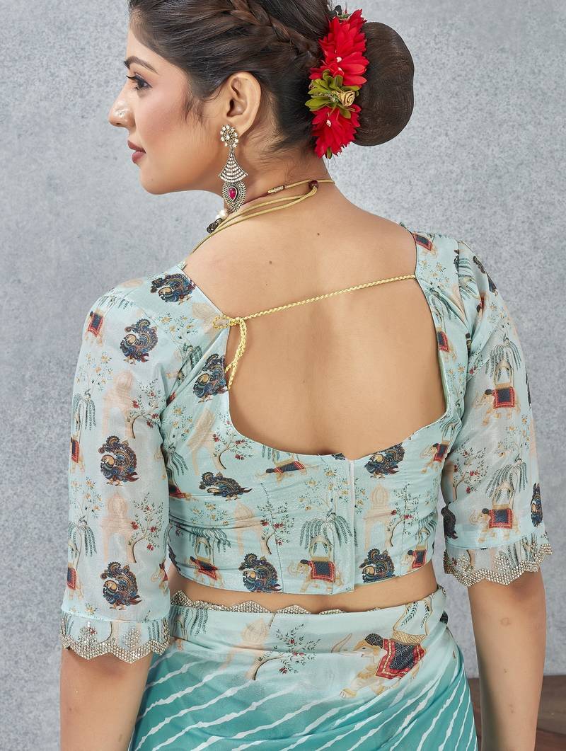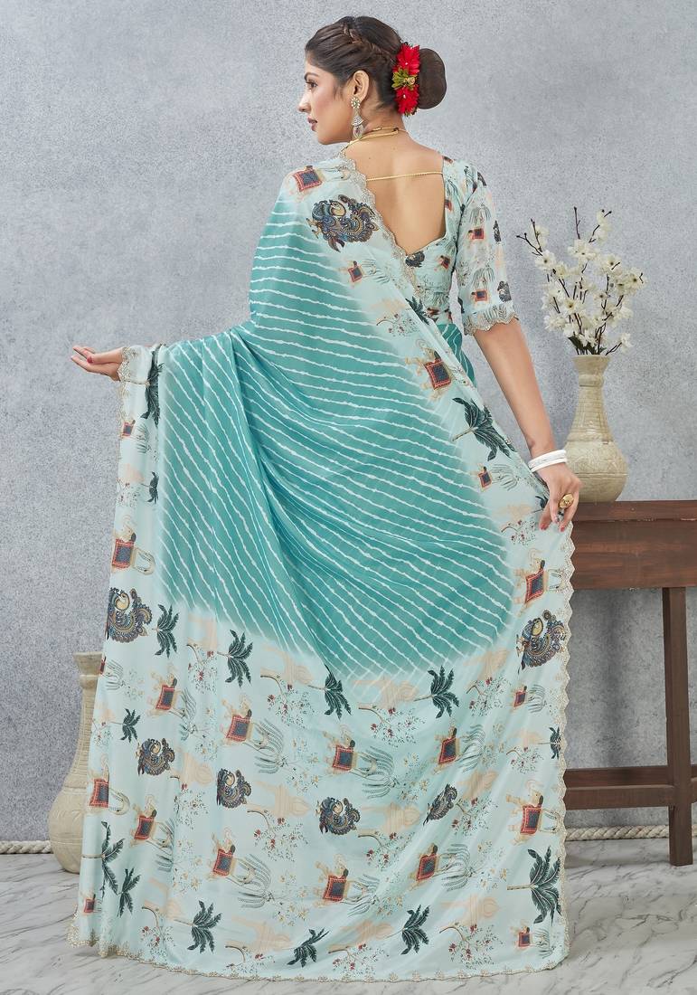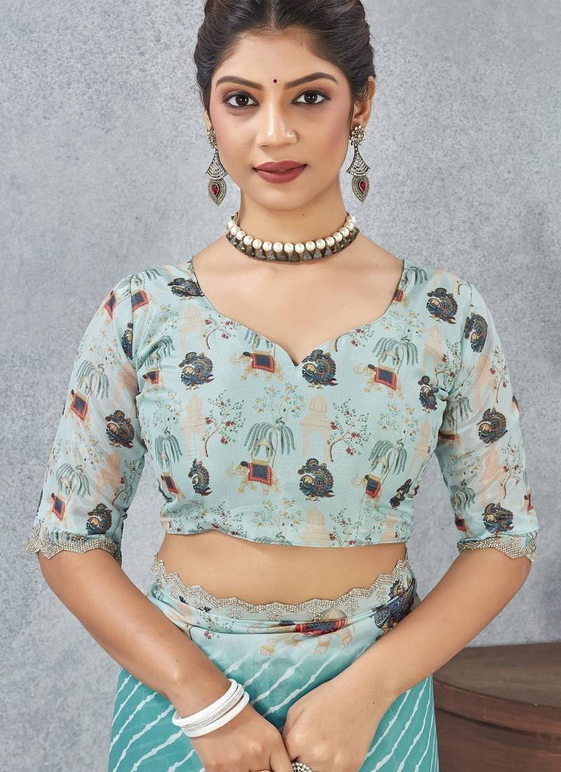 Sky blue color zirkon cut border worksatin digital printed saree with blouse