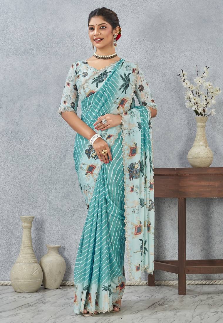 Product Name | Sky Blue Color Zirkon Cut Border Worksatin Digital Printed Saree With Blouse | |