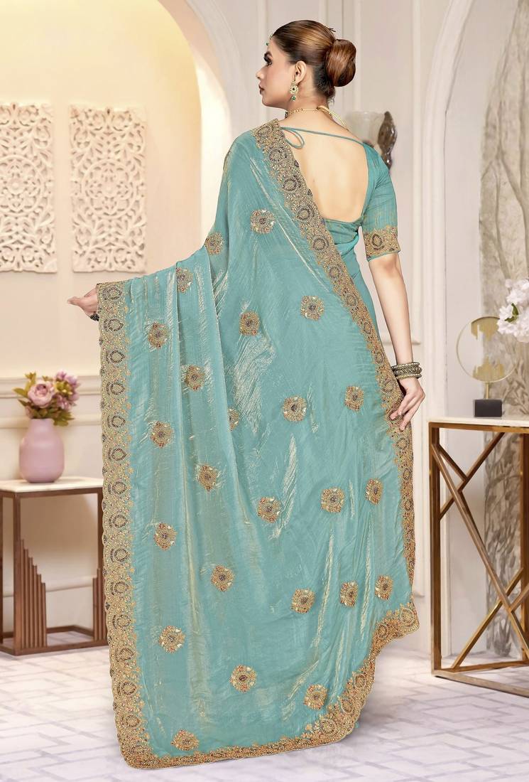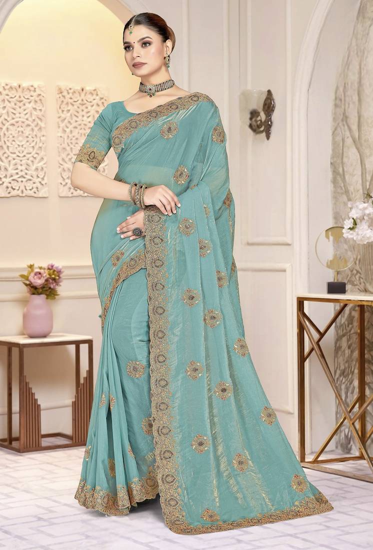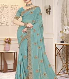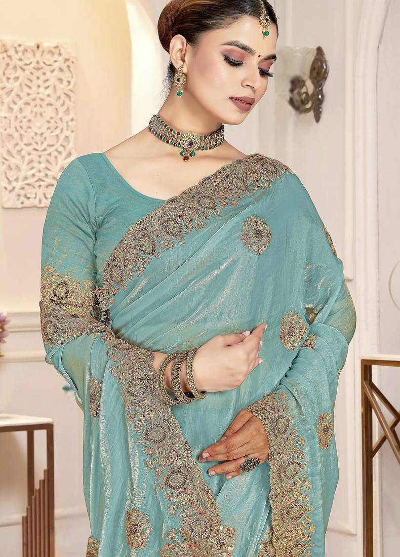 Sky blue color zirkon work & codding embroidered fendy satin silk saree with blouse