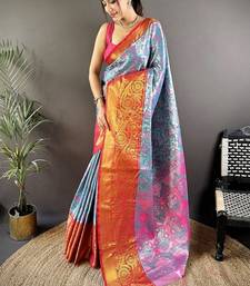 Sky blue & red color woven zari work kanjivaram tissue art silk saree