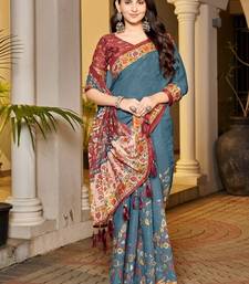 Teal blue color handloom art silk digital printed saree