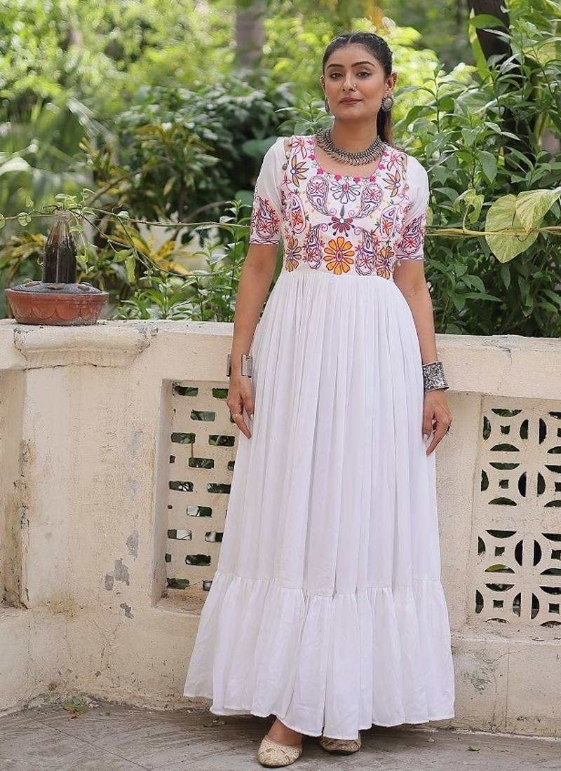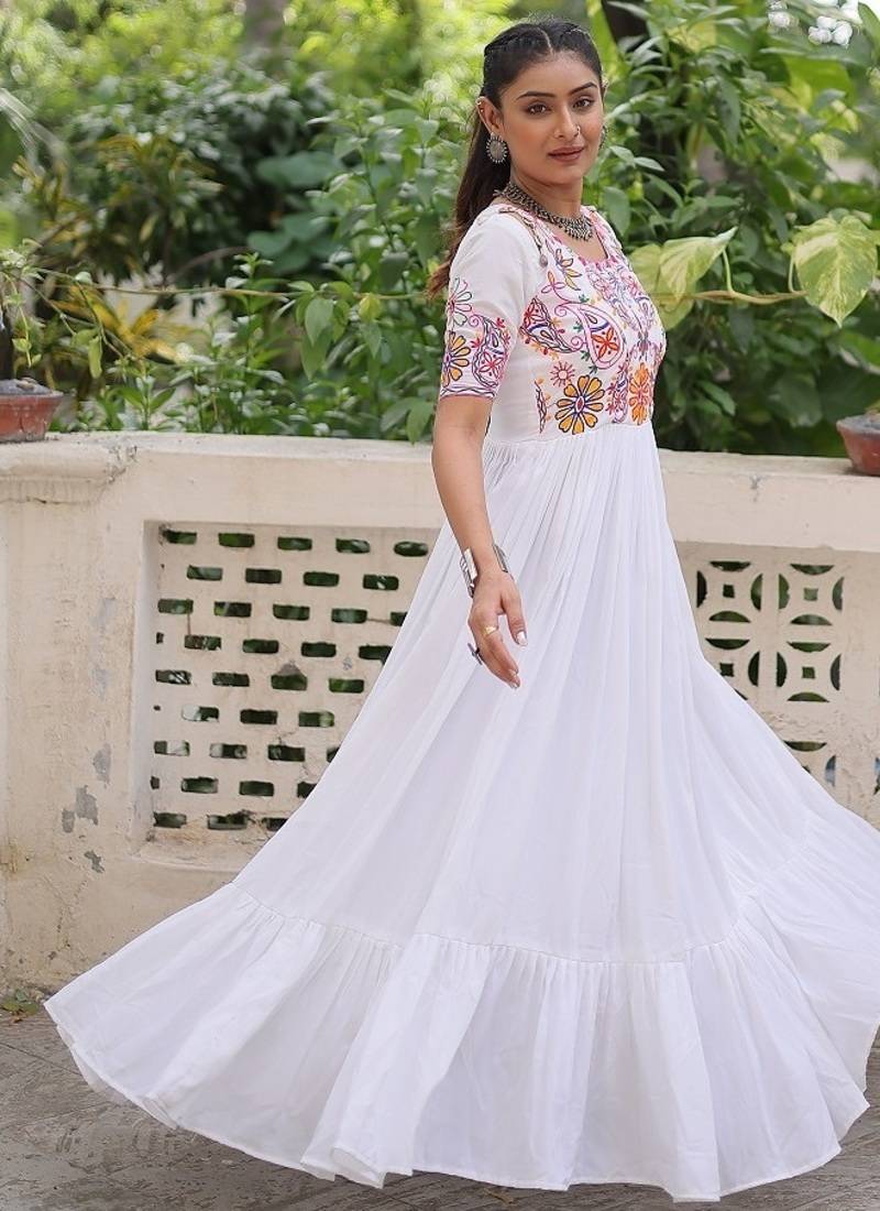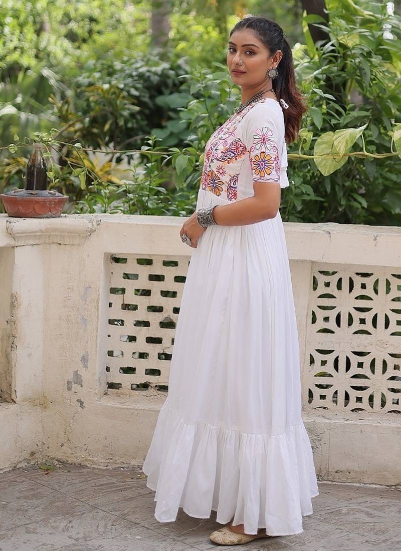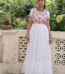 White color thread embroidered kutchi gamthi work rayon gown stitched