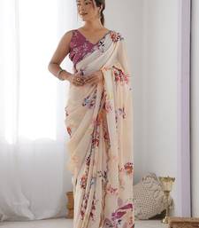 White & purple georgette printed mirror lace work saree