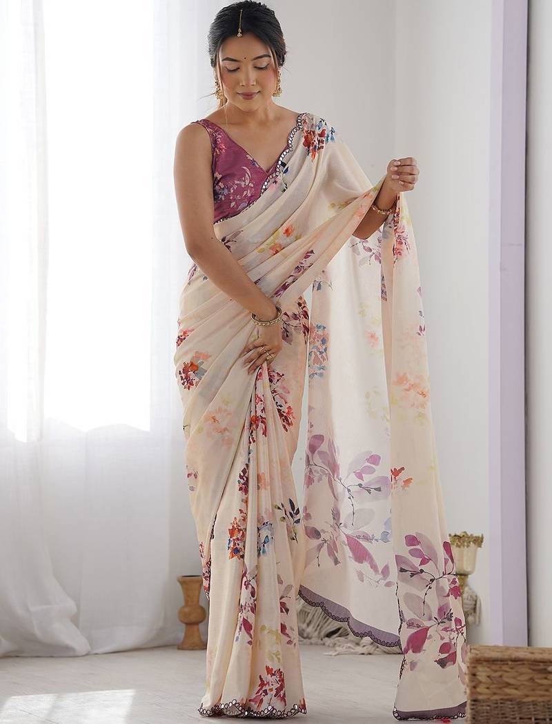 | Product Name | White & Purple Georgette Printed Mirror Lace Work Saree | |