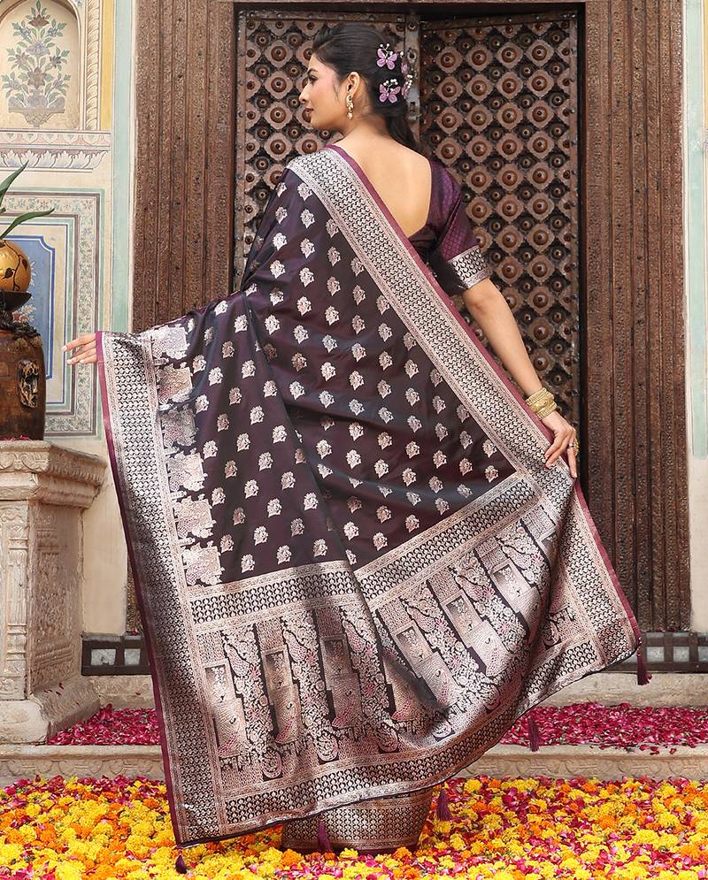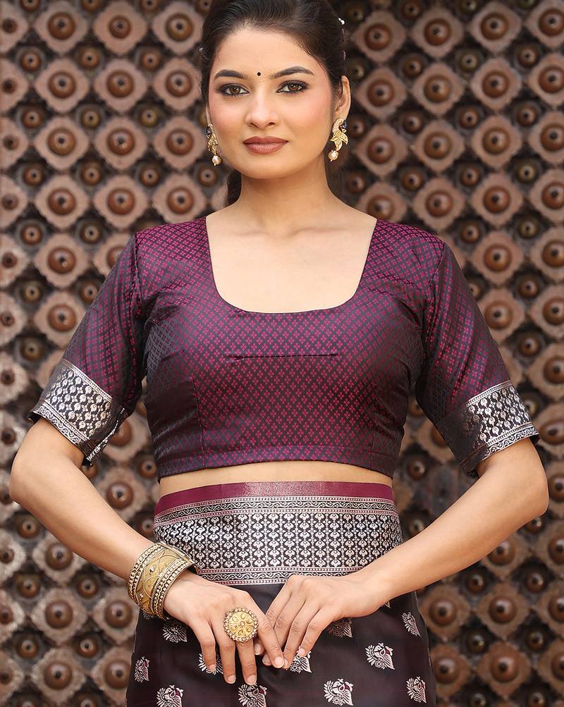 | Product Name | Wine Color Zari Woven Silk Blend Saree With Un Stitch Blouse | |
