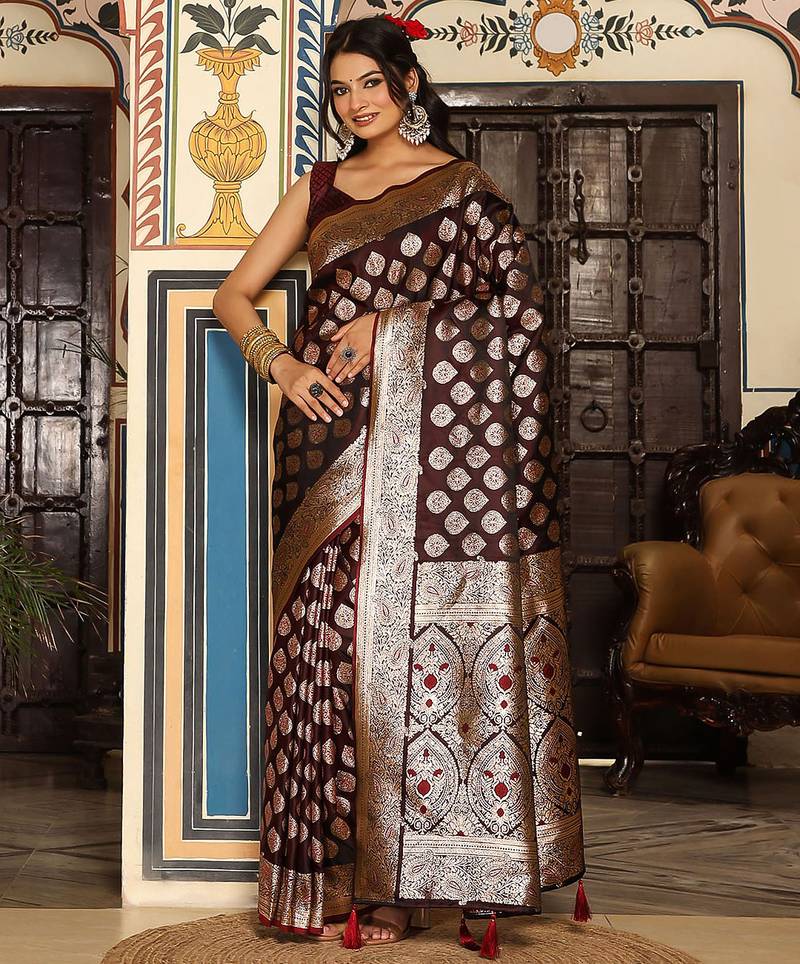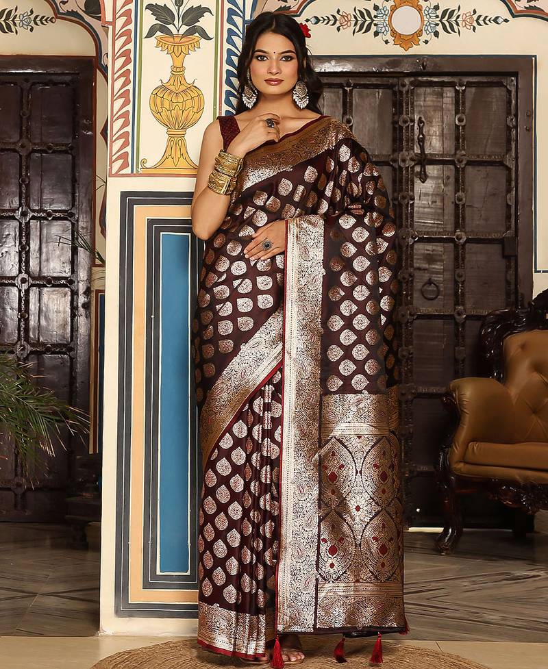 Wine color zari woven silk blend saree with un-stitch blouse
