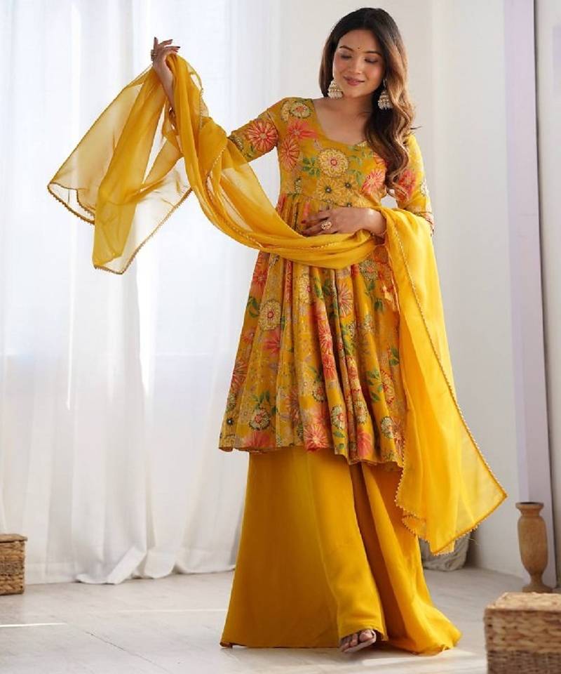 Yellow color romansilk chanderi discharge print kediya style top plazzo dupatta. stitched