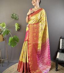 Yellow & pink color woven zari work kanjivaram tissue art silk saree