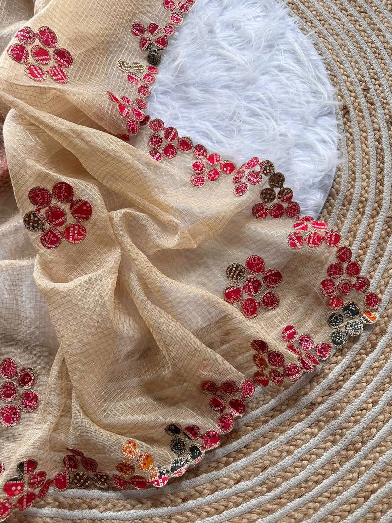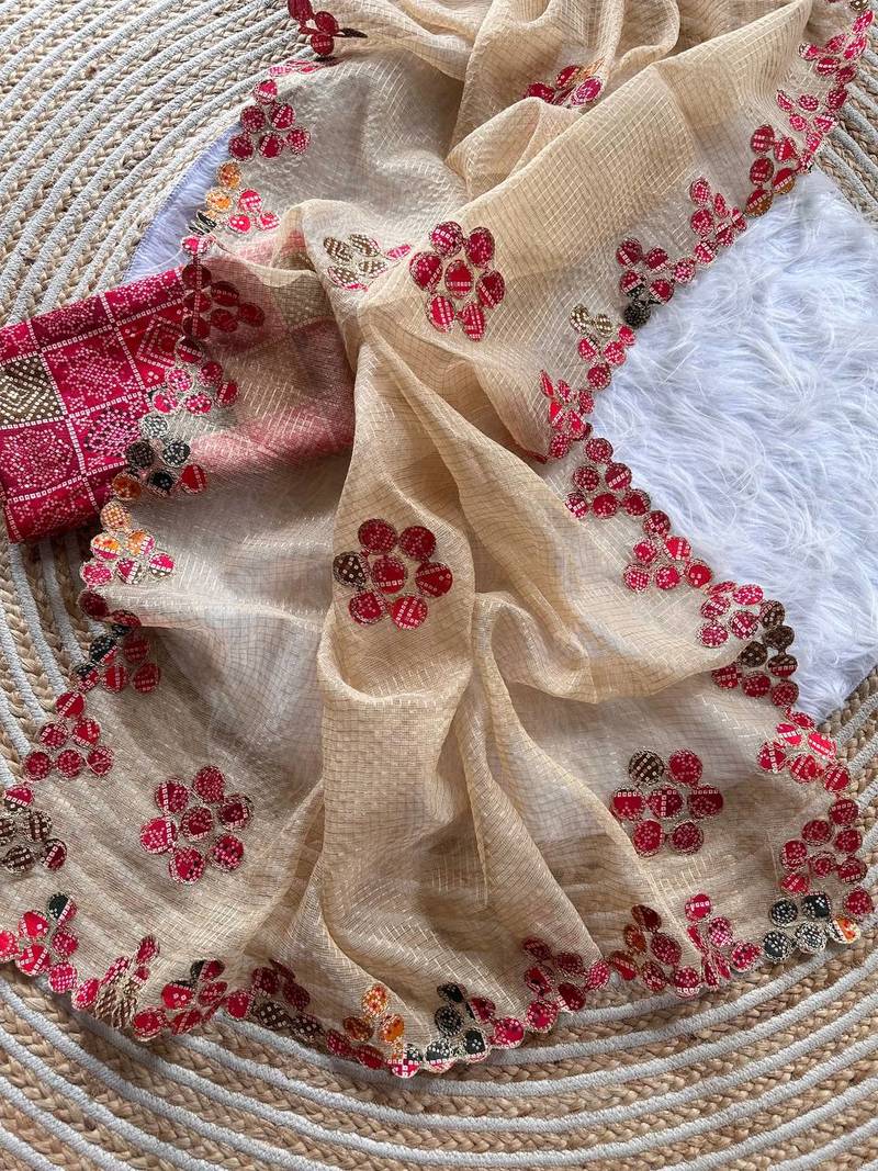 | Product Name | Cream Color Bandhani Patch Work Kota Doriya Saree | |