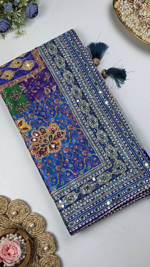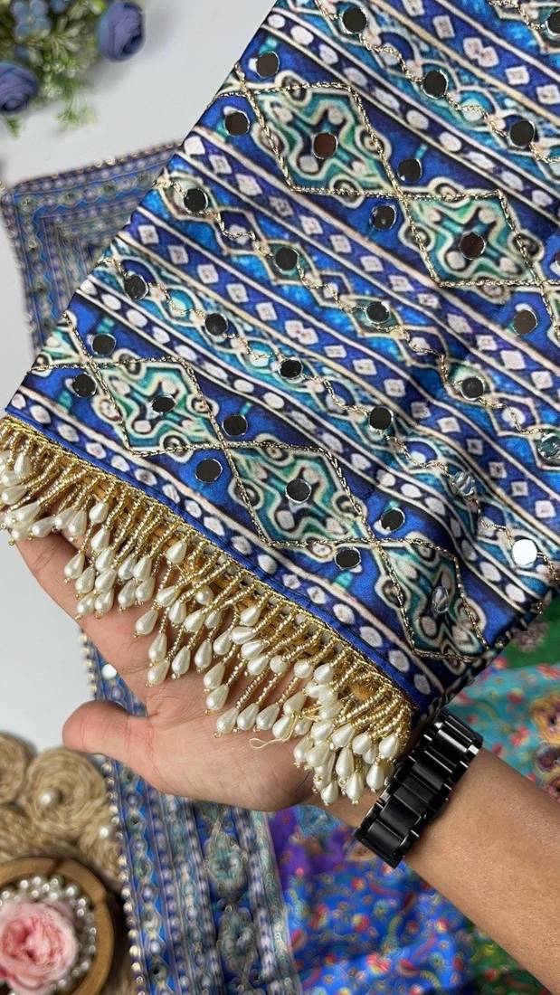 | Product Name | Multi Color Digital Print With Aari Work & Mirror Work Japan Satin Saree | |