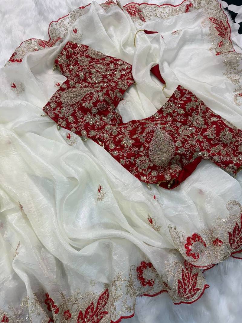 | Product Name | White Color Embroidery Work And Coding Weaving Tissue Silk Saree | |