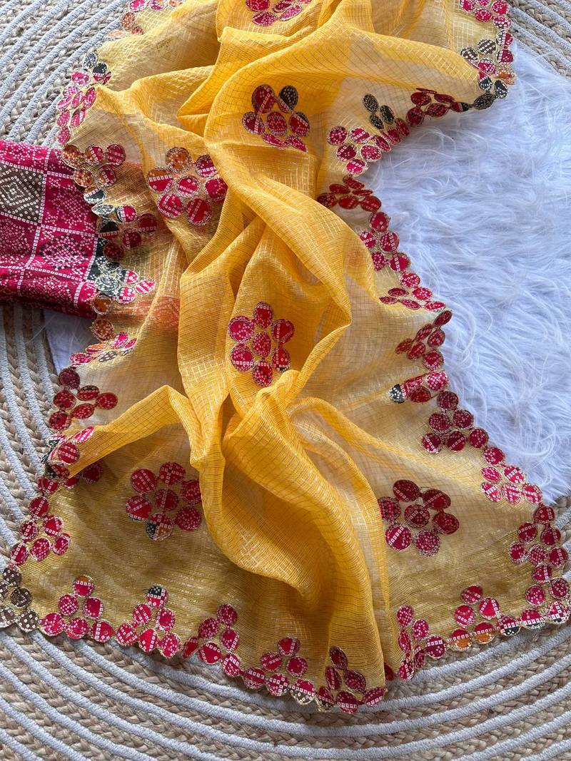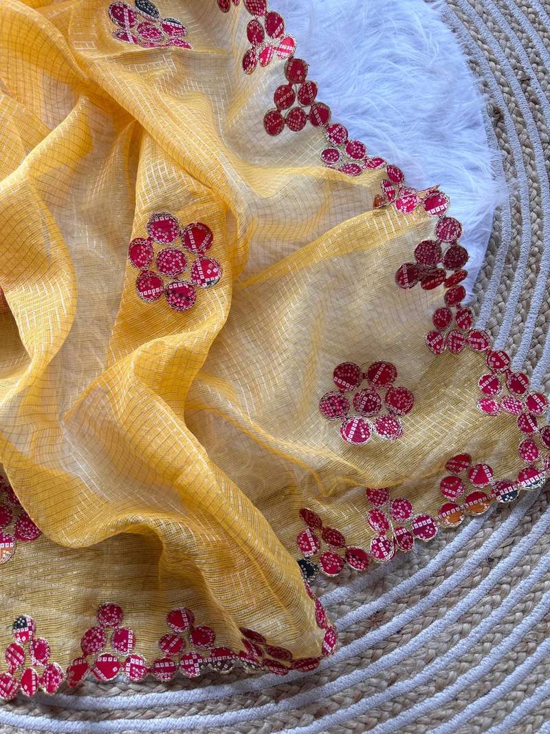 | Product Name | Yellow Color Bandhani Patch Work Kota Doriya Saree | |