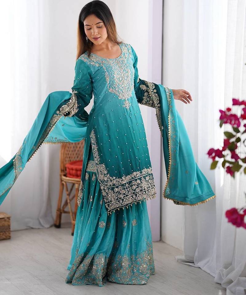 | Product Name | Aqua Blue Color Dori,Sequence And Rivet Moti Work Chinon Silk Top Bottom Dupatta Set | |