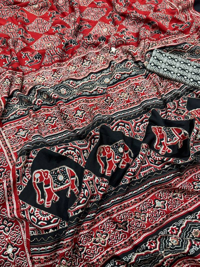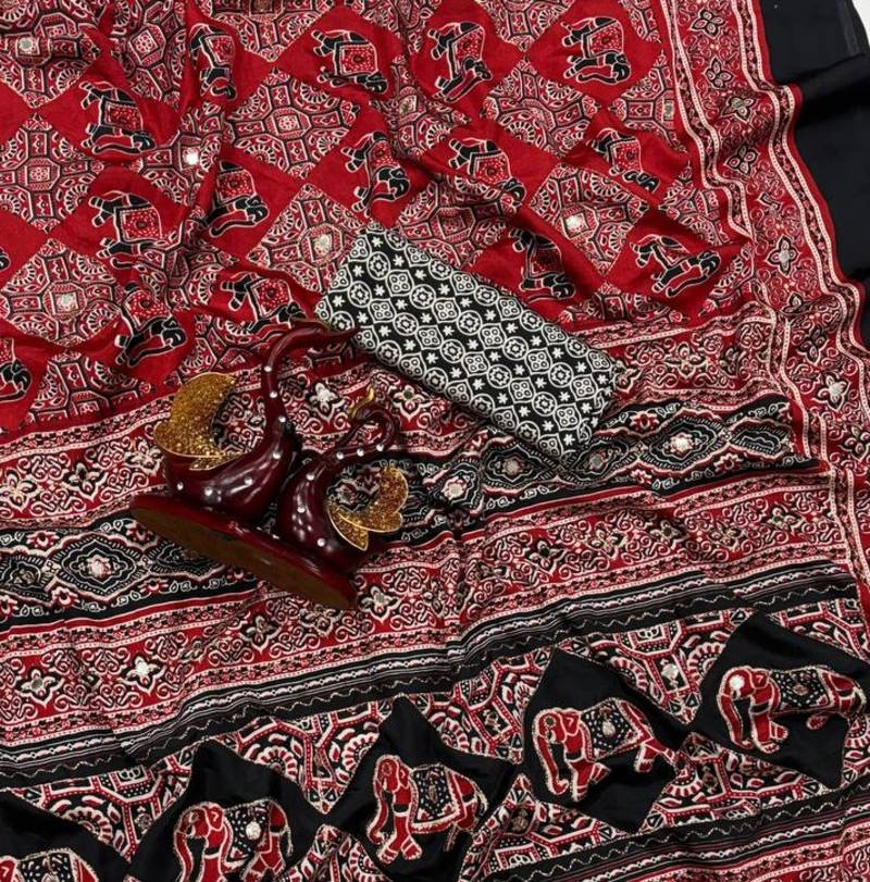 | Product Description | Saree Fab. : Crepe Silk Work : Beautiful Ajarakh Print With Zari And Mirror Work Blouse: Crepe Silk |