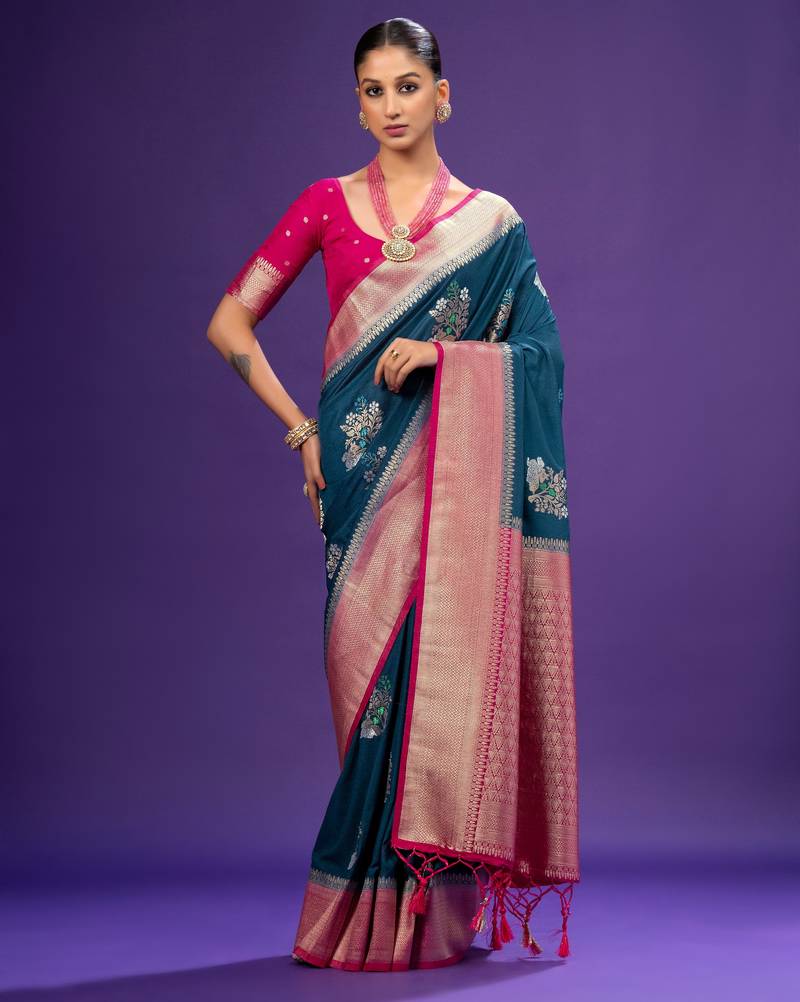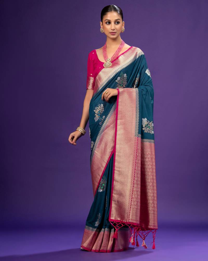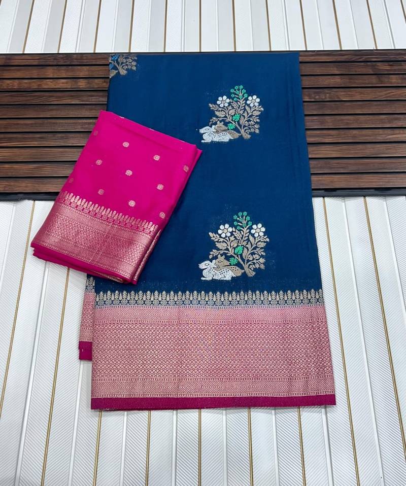 Blue color jari meena jaqurad weveing work khadi silk georgette saree