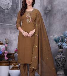 Brown color embroidery thread with hand work roman silk kurta pant set stitched