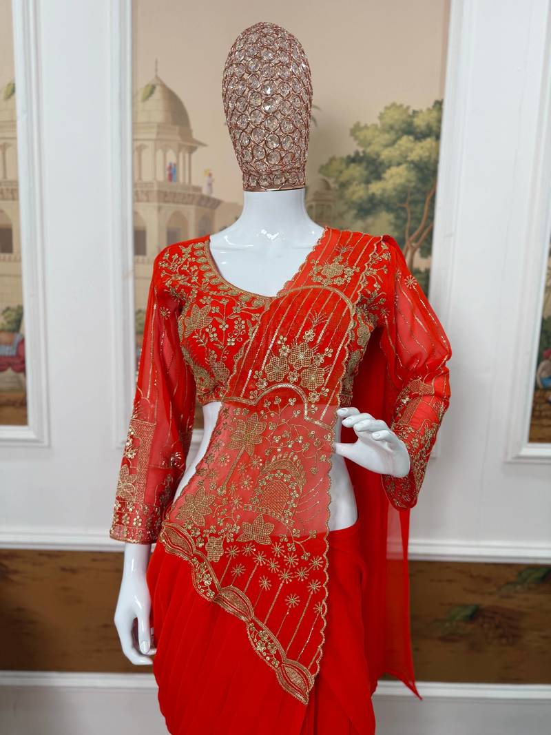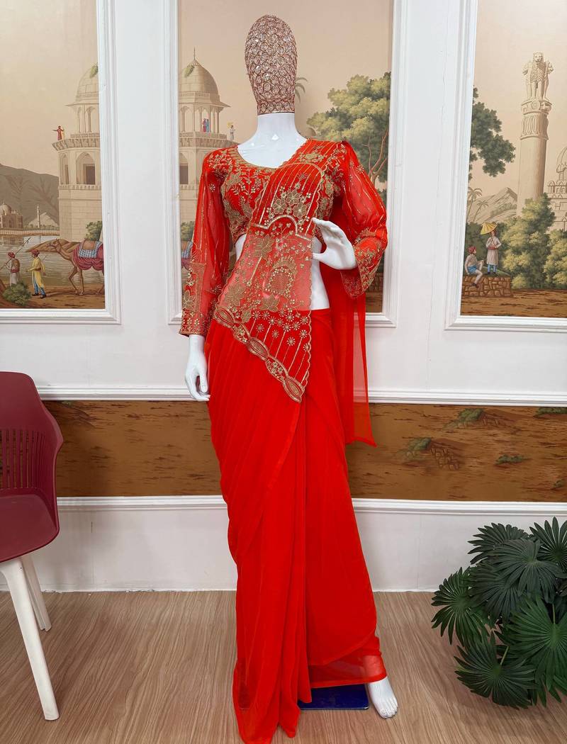 | Product Name | Orange Color Embroidered,Thread & Beads Work Work Faux Georgette Ready To Wear Saree | |