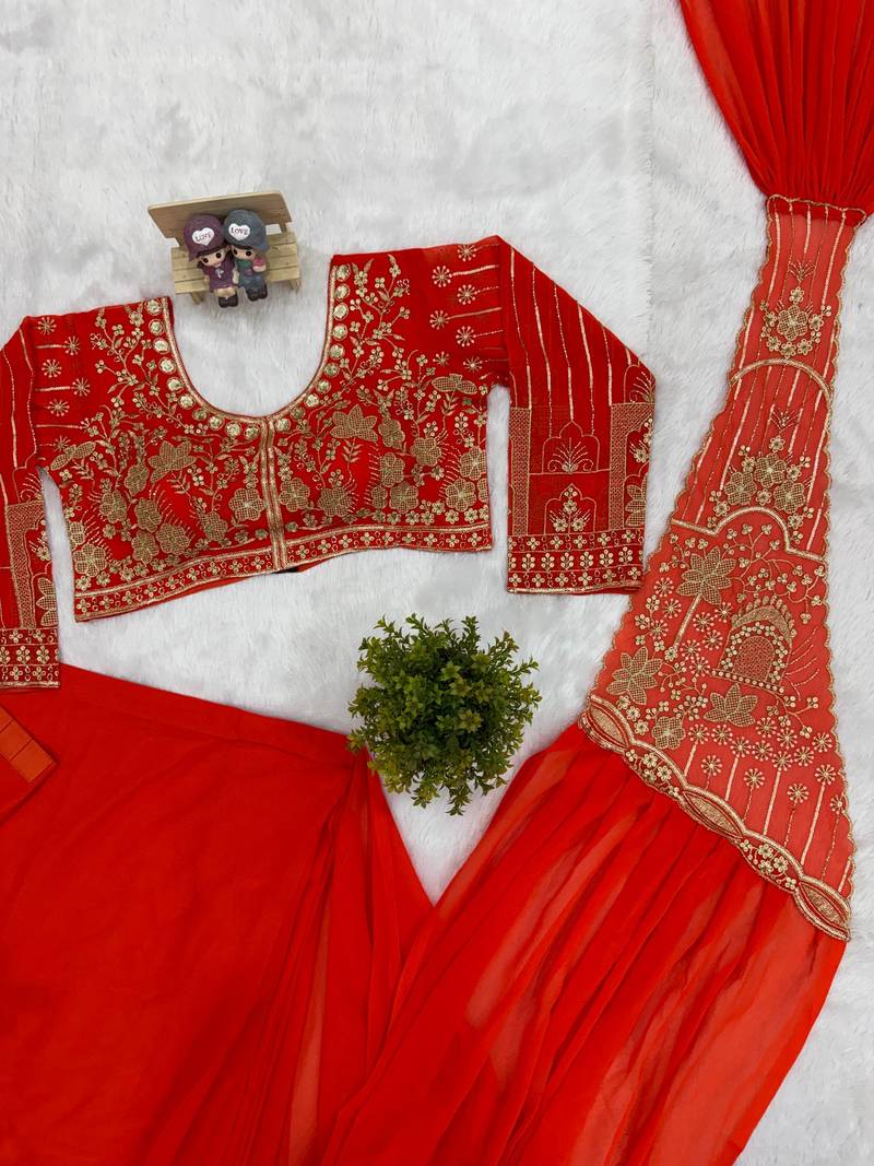 Orange color embroidered,thread & beads work work faux georgette ready to wear saree