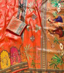 Orange color jaqurad weaving with print work dola silk saree