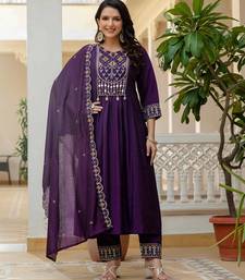 Purple color embroidery thread with real mirror hand work viscose roman silk kurta pant set.