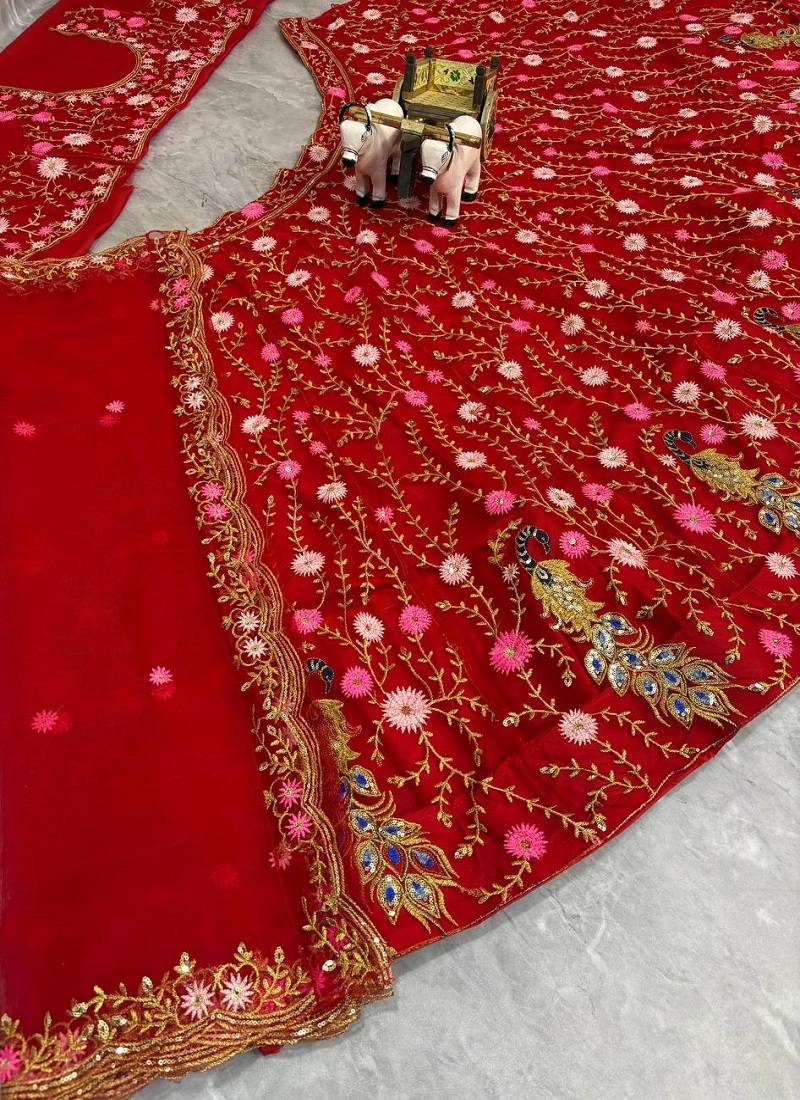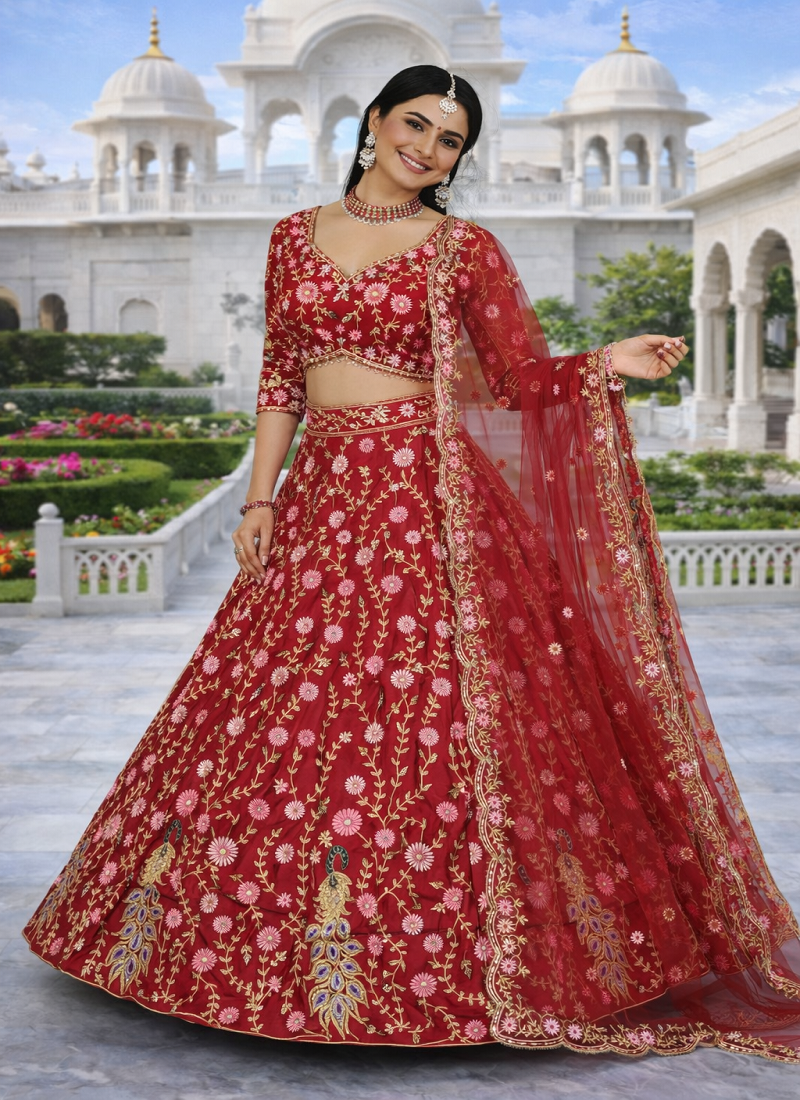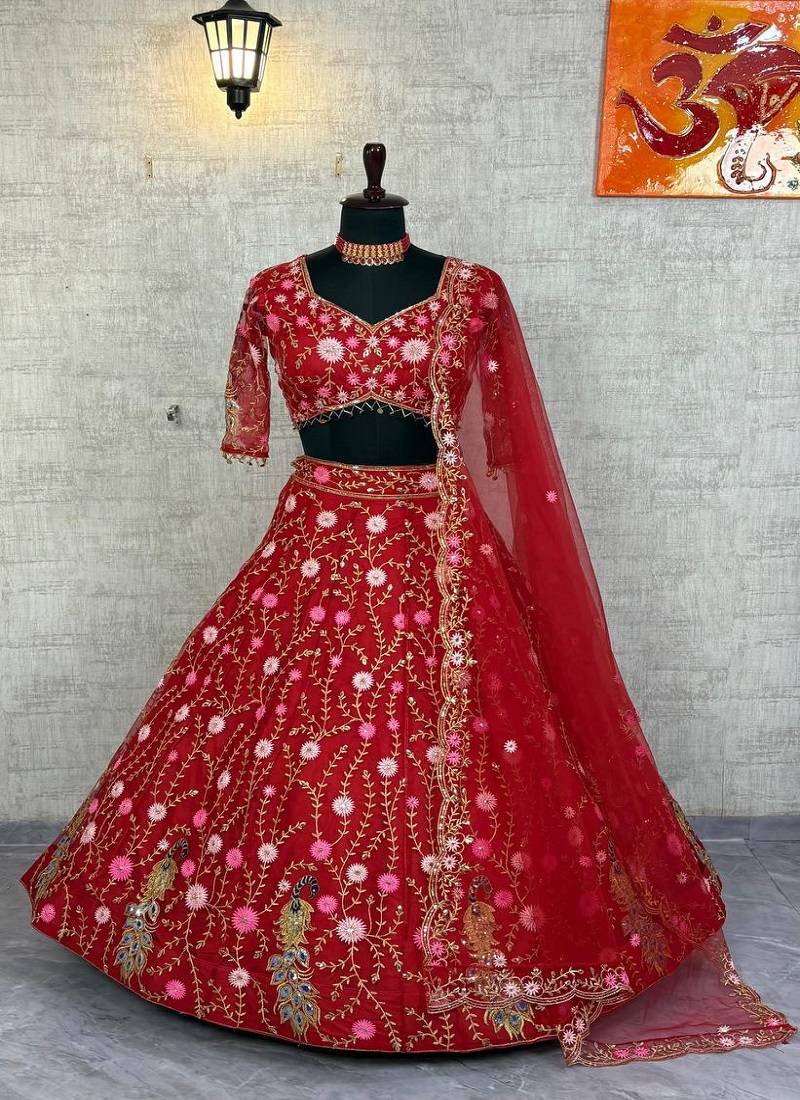 Red color embroidery sequins work net lehenga choli dupatta silk