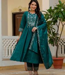 Teal color embroidery thread with real mirror hand work viscose roman silk kurta pant set.