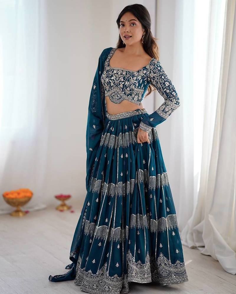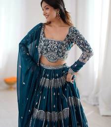 Teal color thread embroidery with sequin work faux georgette lehenga choli set