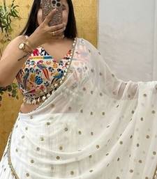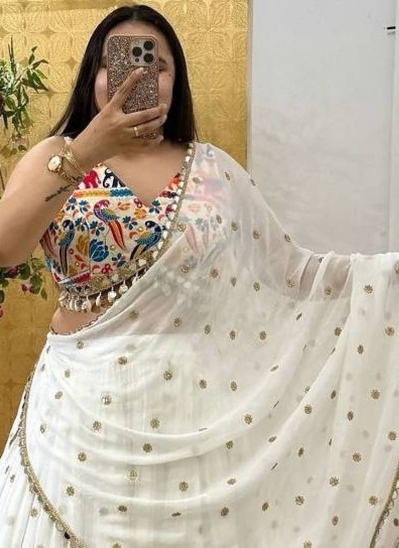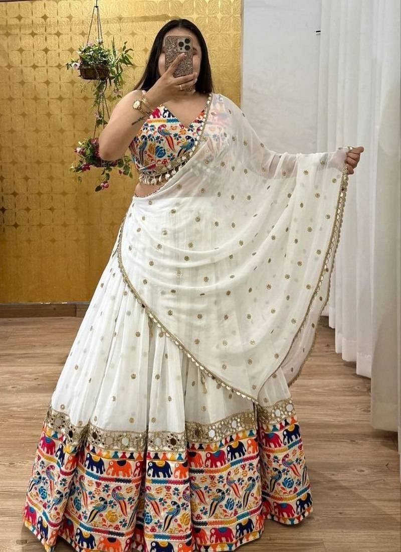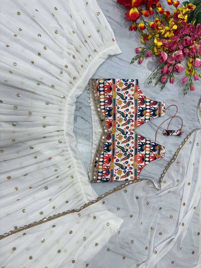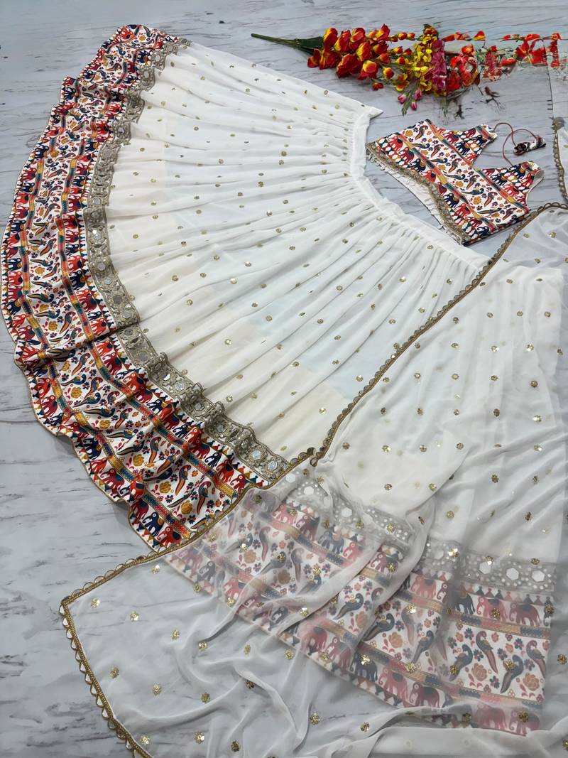White color sequins,digital print with real mirror work georgette lehenga choli