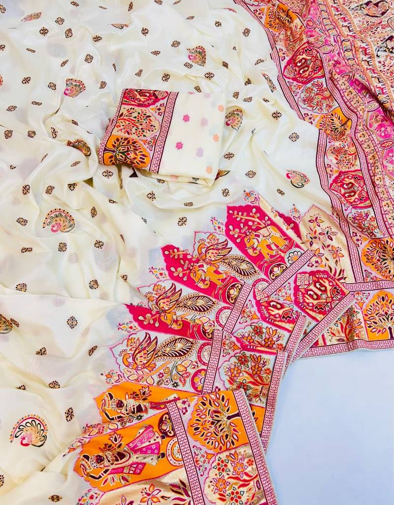 | Product Name | White Color Zari Weaving Work Pashmina Silk Blend Saree | |