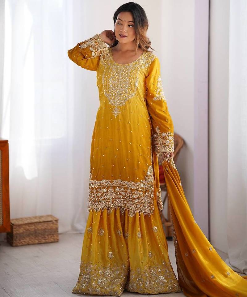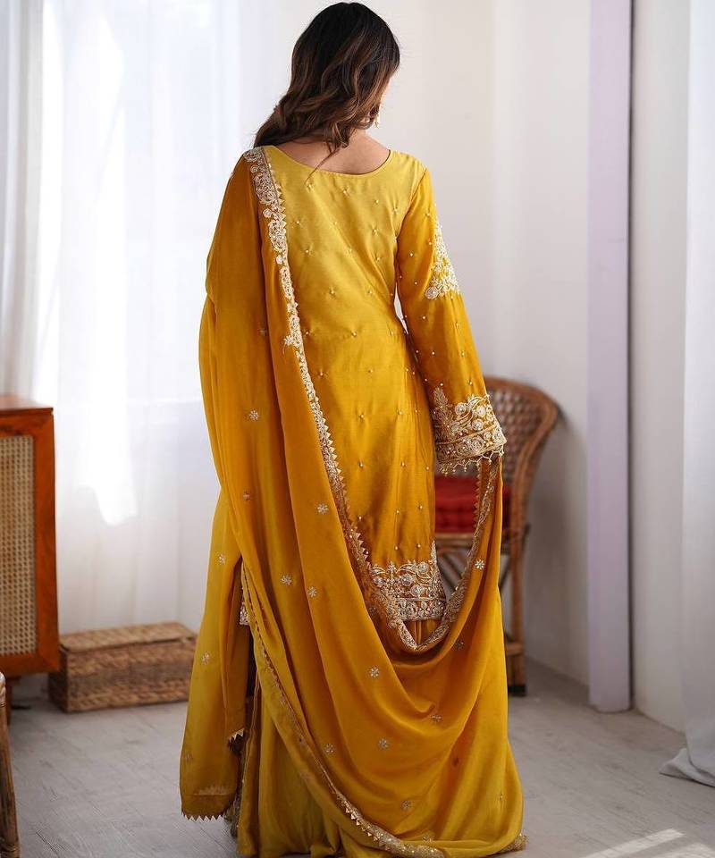Yellow color dori,sequence and rivet moti work chinon silk top bottom dupatta set stitched