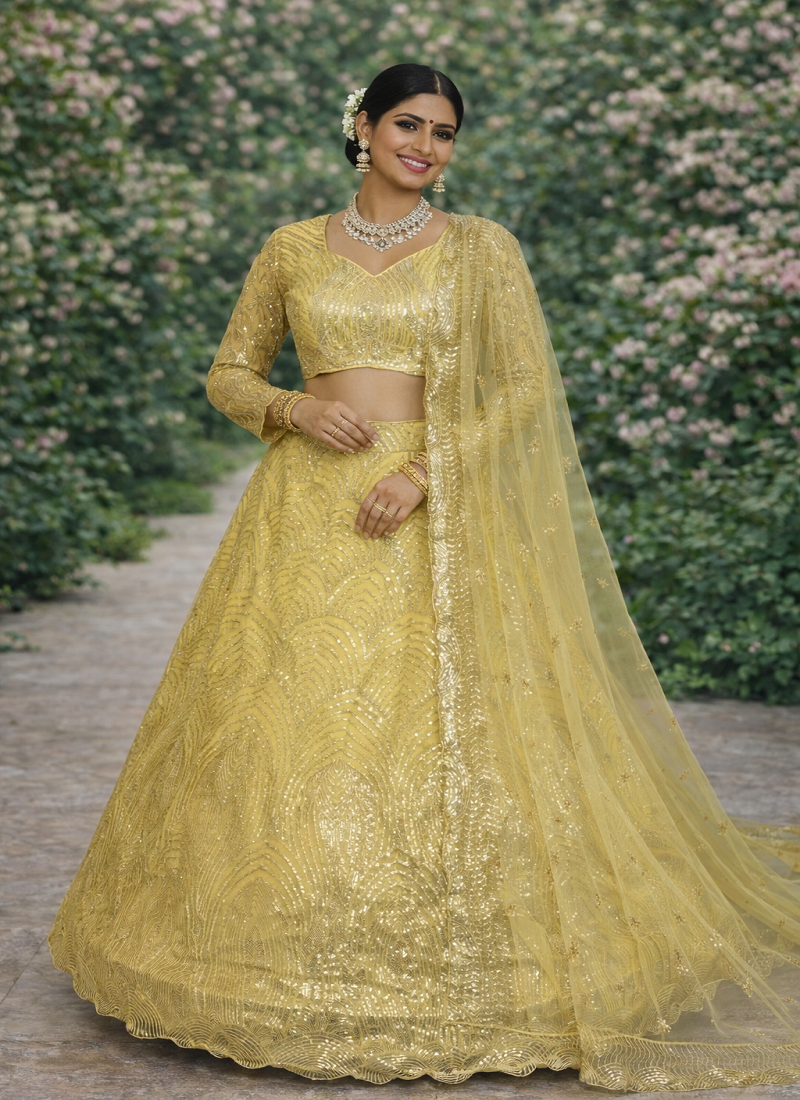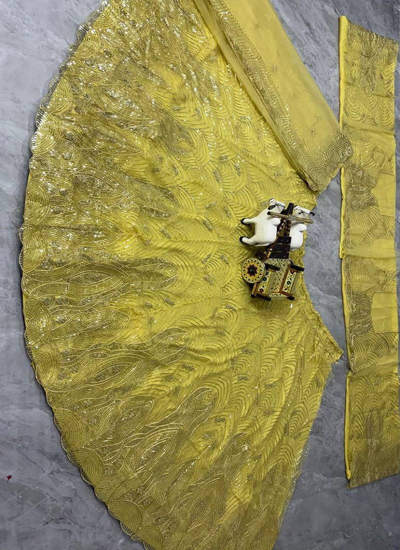 Yellow color embroidery sequins work net lehenga choli dupatta set