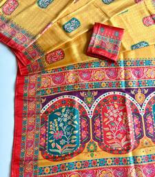 Yellow color jari weaving with print work softy silk saree
