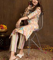 Cream printed cotton blend kurta pant set stitched