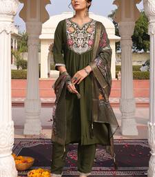 Mehndi green cotton silk thread & sequin designer salwar suit with printed dupatta stitched