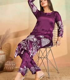Purple printed cotton reyon kurta pant set stitched