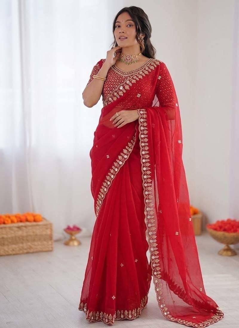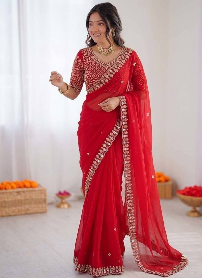 Product Name Red Sequence Beds Work Organza Silk Party Wear Saree