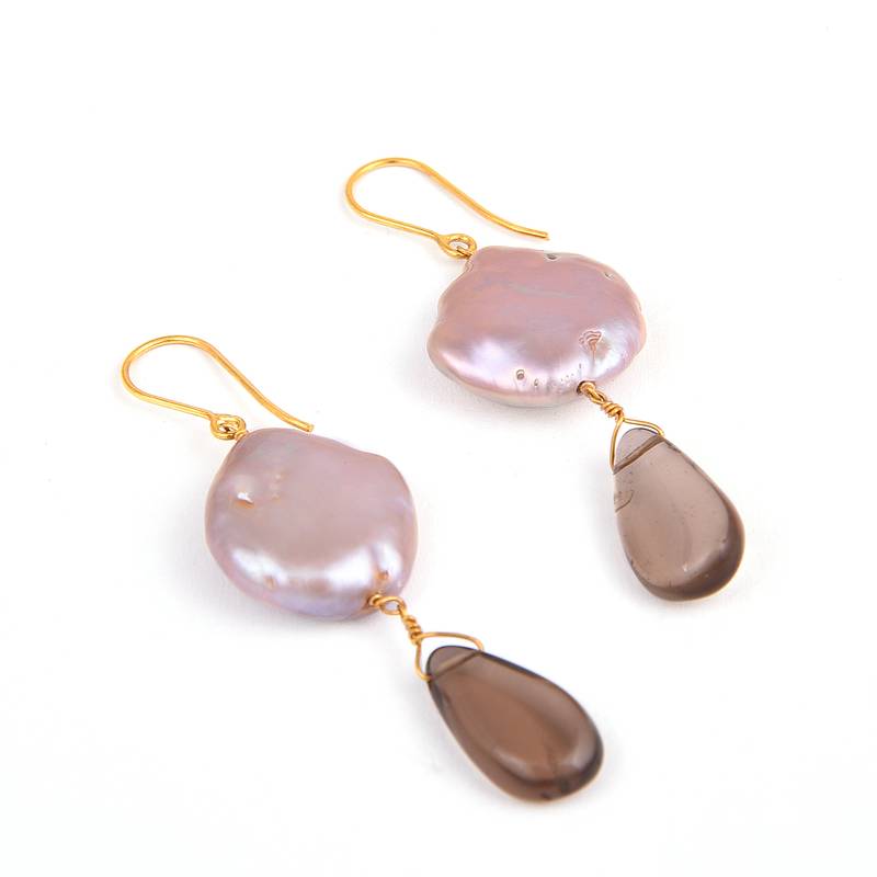 | Product Description | Freshwater Coin Pearl With Smoky Quartz Dangles . Handcrafted In 18k (750) Yellow Gold Hooks & Wire And Embellished With Tiny Gold Foil Beads. Pearls & Gemstones/Beads May Vary Slightly In Shade, Shape & Size From The Ones Pictured. Computerized Gold Testing Certificate Provided. |