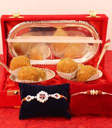 | Package Details | Haldiram S Besan Laddu Of 500 Gm / German Silver Bowl Set With 2 Spoons And 1 Tray / 2 Rakhis / 1 Cushion / Roli And Chawal. | |