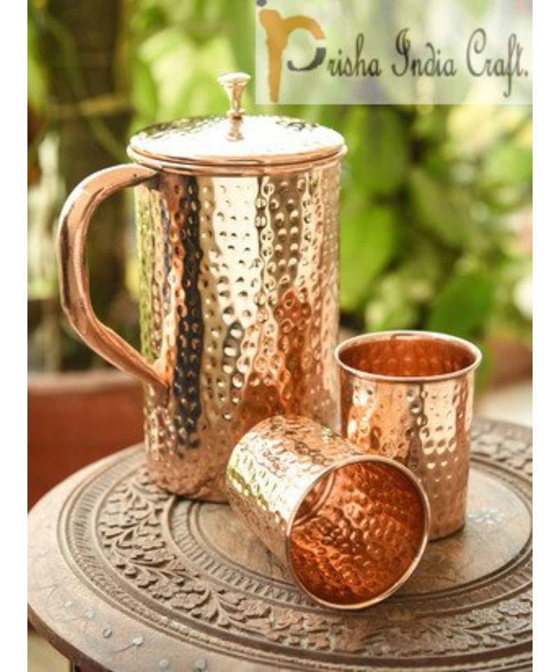 Pure copper hammered jug pitcher with lid capacity 1650 ml with 2 pure copper hammered glass tumbler capacity 250