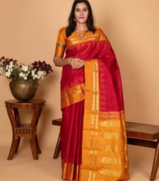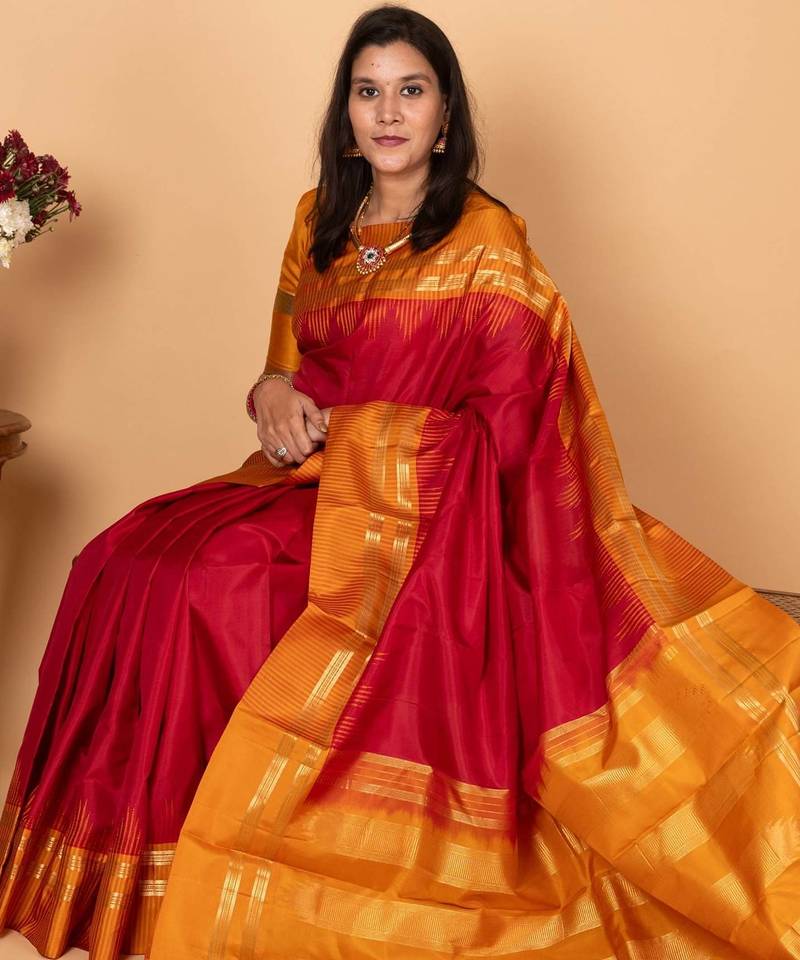 Apple red and gamboge yellow pure kanchi silk saree)