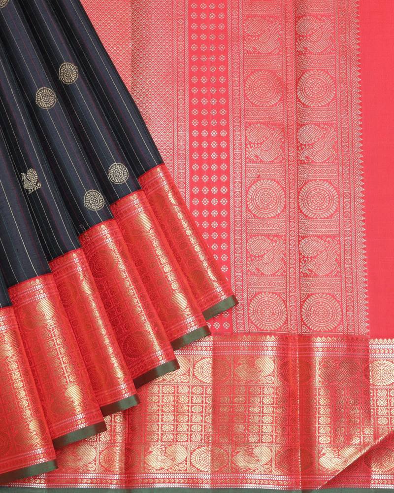 | Product Name | Black And Pinkish Red Pure Zari Silk Saree | |