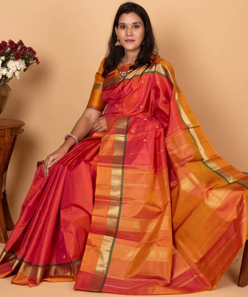 Dual tone orange and dual tone yellow pure kanjivaram silk saree