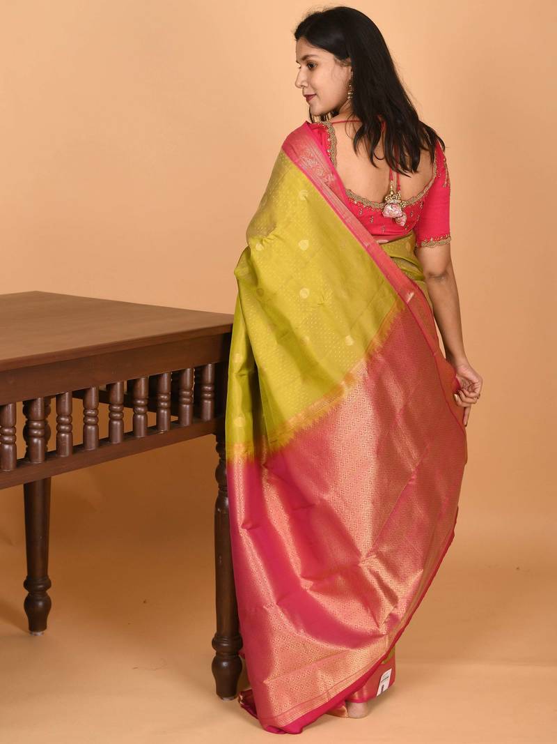 Product Name Pear Green And Rani Pink Small Border Pure Kanjivaram Silk Saree