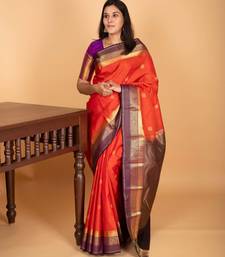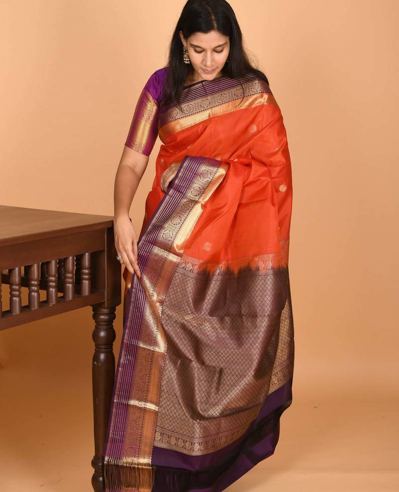 | Product Name | Pumpkin Orange And Eggplant Purple Butta Weave Kanchi Pure Silk Saree | |