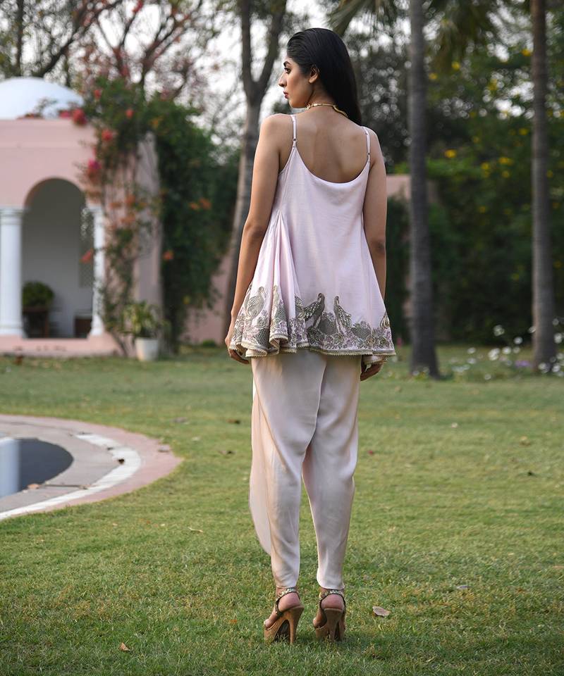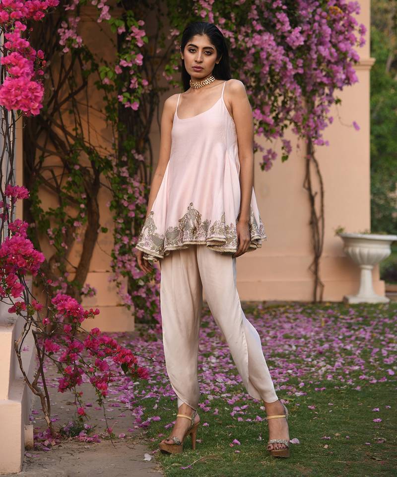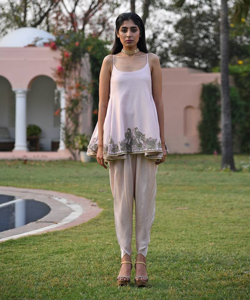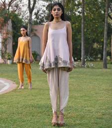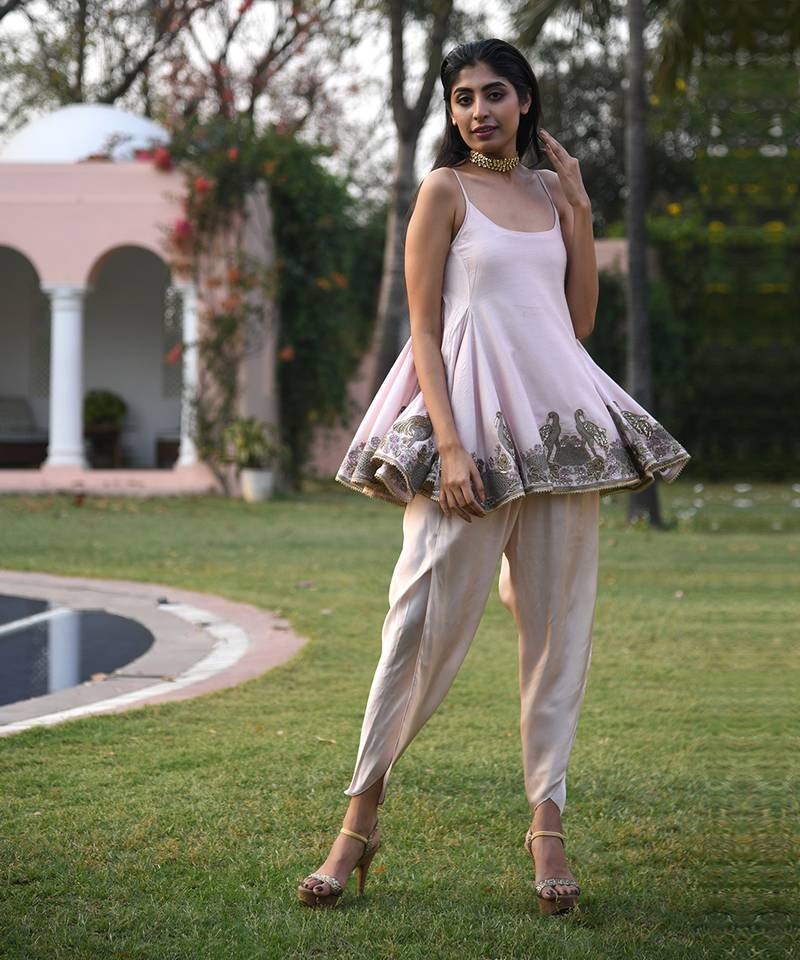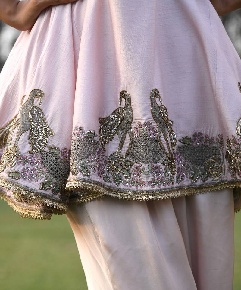 | Product Description | Rawsilk Peplum Kurta With Intricate Zari Embroidery And Fine Jalliwork. With Satin Tulip Pants |