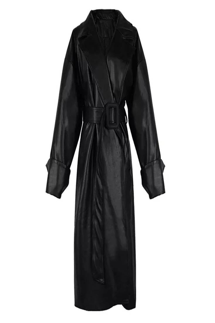 Women’s black leather trench coat belted longline classic elegant outerwear