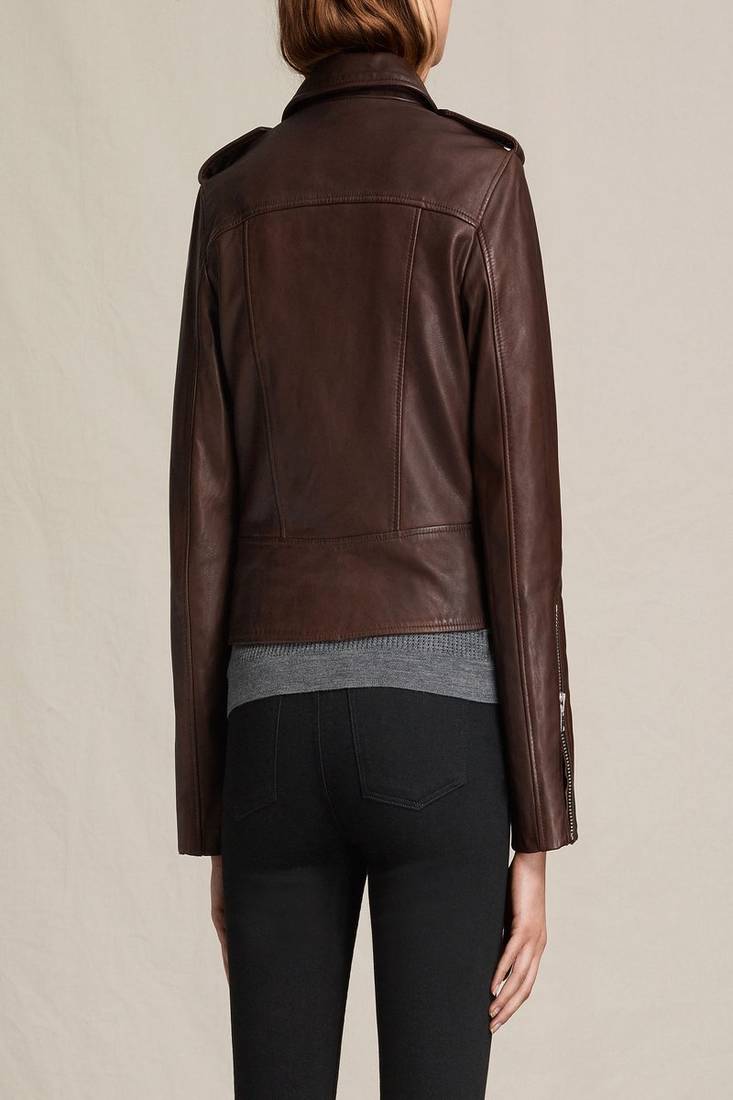 Women’s brown leather biker jacket asymmetrical zip slim fit style
